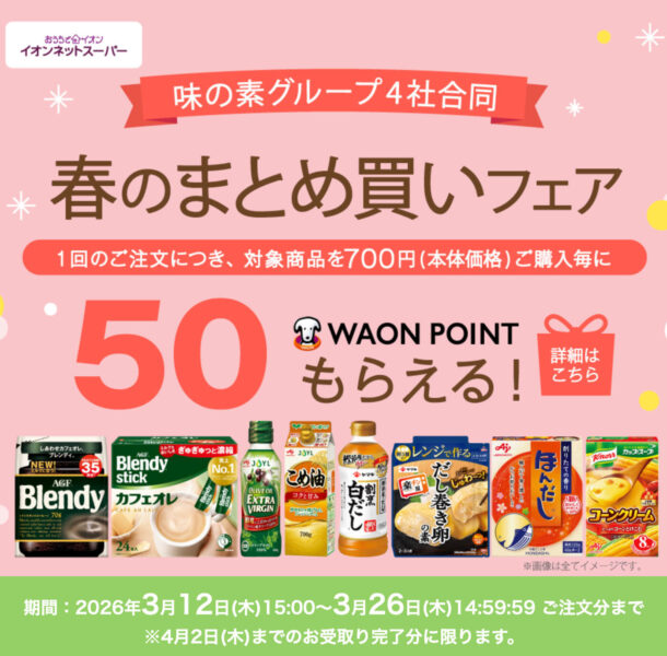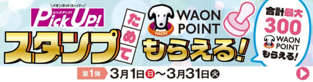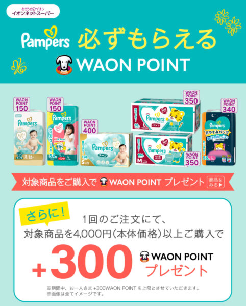 対象商品を1,000円以上買いすれば、300WAONポイントがもらえるキャンペーンが実施中です。