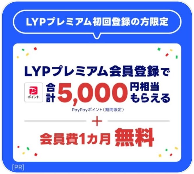 LYPプレミアムは新規登録でPayPayポイント5,000円分がもらえるキャンペーンを実施しているので、送料無料だけでなく注文時の割引クーポンとしても使えます!